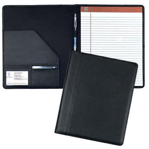 This padfolio made from soft split grain leather has a professional design and is built to last for years of service. Features include large inside leather pocket, clear card pocket, pen loop and a standard writing pad. Price includes a debossed logo on front.